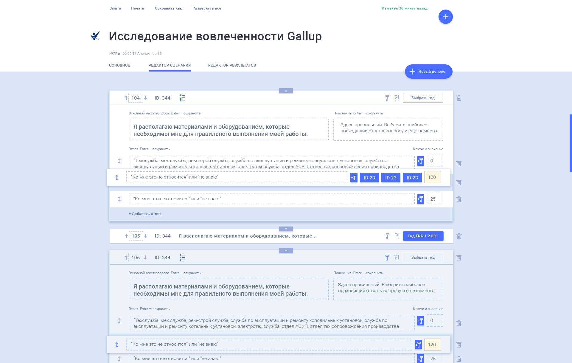 Встроенный редактор позволяет быстро создавать новые анкеты, адаптировать имеющиеся или использовать готовые методики опросов.